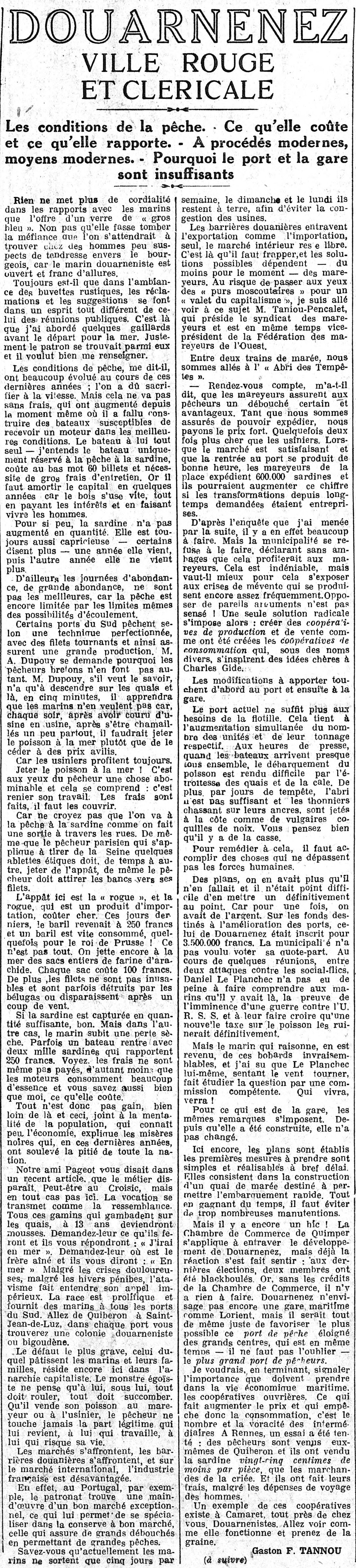 Ville, Ville rouge, Marins, Conditions de travail, Évolution, Motorisation, Frais, Entretien, Amortissement, Capital, Intérêts, Pêche à la sardine, Techniques de pêche, Filets tournants, Opposition, Avilissement, Prix, Rejet à la mer, Appât, Rogue, Barils, Cherté, Farine d'arachide, Filets, Destruction, Bélugas, Essence, Coût, Marché, Concurrence étrangère, Mareyeurs, Débouchés, Demande, Transformation, Municipalité, Refus, Solution, Création, Coopératives, Travaux du port, Difficultés, Débarquement, Agrandissement du port, Argent, Fonds, Gare, Construction, Quai de marée, Chambre de commerce