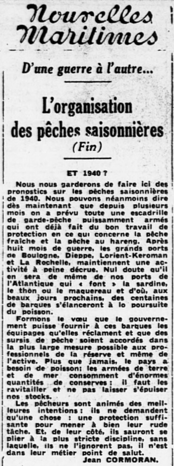 Journal L'Ouest-Eclair Date 12 mai 1940 Mots-clés Guerre, Organisation, Pêches saisonnières, Pronostic, Sardine, Thon, Maquereau, Gouvernement, Équipages, Sursis, Conserves, Ravitaillement, Stock, Pêcheurs, Demande, Protection Lieu(x) Boulogne, Dieppe, Lorient, La Rochelle, Côte Atlantique Contributeur(s) Jacques Join Image