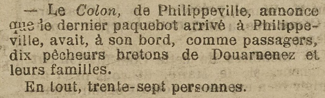 Journal La Dépêche algérienne Date 04 février 1892 Mots-clés Pêcheurs bretons, Émigration, Familles, Colonies, Paquebot, Passagers Lieu(x) Algérie, Philippeville, Algérie, Douarnenez Contributeur(s) Jacques Join Image