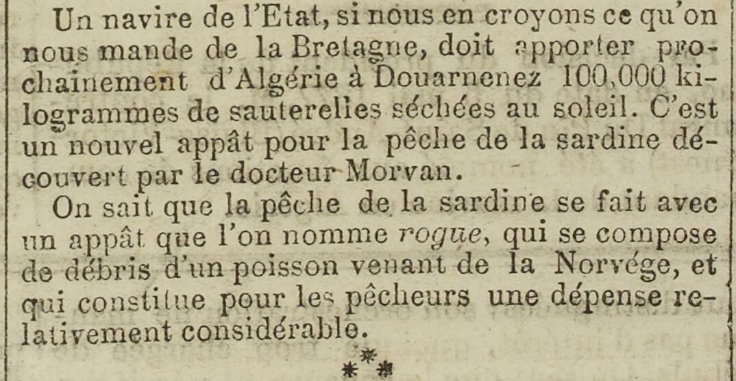 Journal La Liberté Date 07 mai 1877 Mots-clés Nouvelles, Navire de l'État, Transport, Cargaison, Sauterelles, Appât, Rogue, Rogue Morvan, Pêche à la sardine, Découverte, Docteur Lieu(x) Bretagne, Algérie, Douarnenez, Norvège Personnes Dr Morvan Contributeur(s) Jacques Join Image