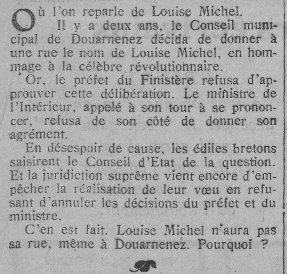 Journal Comœdia Date 23 novembre 1924 Mots-clés Conseil municipal, Noms de rues, Hommage, Révolutionnaire, Refus, Préfet, Ministre de l'Intérieur, Saisine, Conseil d'État Lieu(x) Douarnenez, Finistère Personnes Louise Michel Contributeur(s) Jacques Join Image