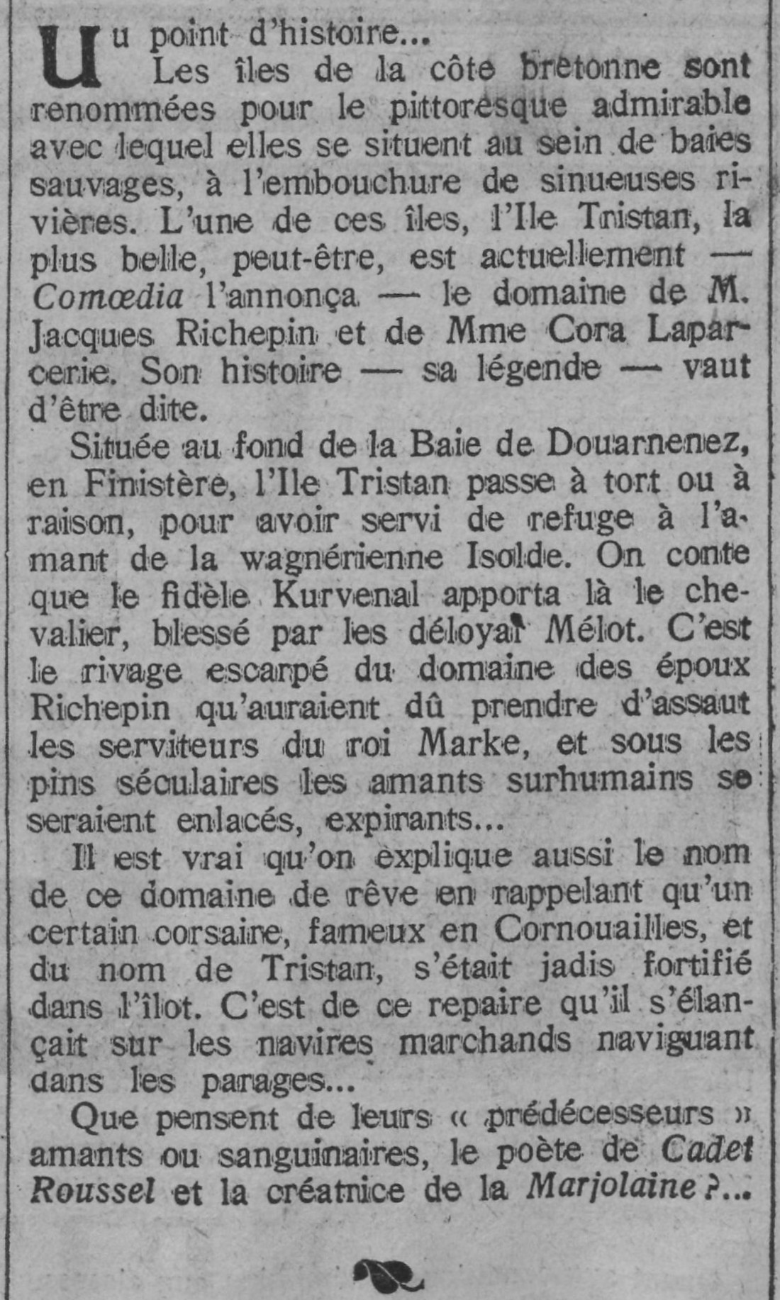 Journal Comœdia Date 06 septembre 1912 Mots-clés Île, Baie, Rivière, Histoire, Légende, Artistes, Repaire, Corsaire, Refuge Lieu(x) Douarnenez, Île Tristan, Baie de Douarnenez, Cornouailles Personnes Jacques Richepin, Cora Laparcerie Contributeur(s) Jacques Join Image
