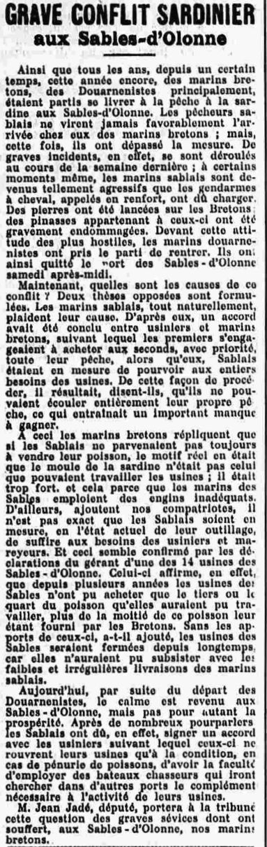 Journal Le Progrès du Finistère. Principal Date 25 septembre 1926 Mots-clés Conflit sardinier, Pêcheurs bretons, Incidents, Agression, Gendarmes, Pinasses, Dommages, Départ, Causes, Accord, Usiniers, Sardine, Moule, Pourparlers, Pénurie, Interpellation, Député Lieu(x) Les Sables-d'Olonne, Douarnenez Personnes M. Jean Jadé Contributeur(s) Jacques Join Image