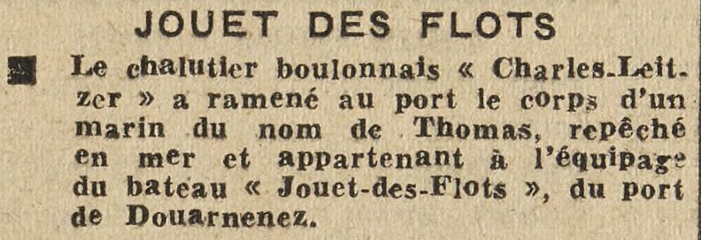 Journal France-Soir Date 20 mars 1949 Bateau(x) JOUET DES FLOTS - DZ3333 Pinasse - 1937-1961 Mots-clés Chalutier, Retour au port, Corps, Matelot, Pinasse Lieu(x) Boulogne-sur-Mer, Douarnenez Personnes matelot Thomas Contributeur(s) Jacques Join Image