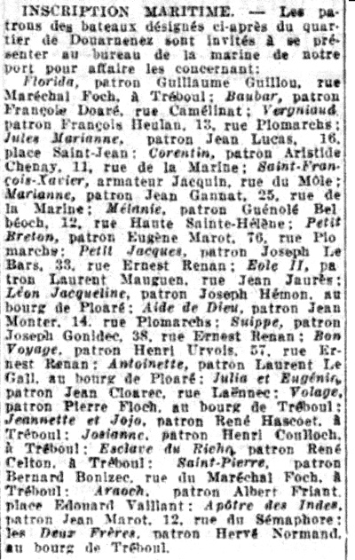 Guillaume Guillou, François Doaré, François Heulan, Jean Lucas, Aristide Chenay, Jacquin, Jean Gannat, Guénolé Belbéoch, Eugène Marot, Joseph Le Bars, Laurent Mauguen, Joseph Hémon, Jean Monter, Joseph Gonidec, Henri Urvois, Lautent Le Gall, Jean Cloarec, Pierre Floch, René Hascoet, Henri Coulloch, René Celton, Bernard Bonizec, Albert Friant, Jean Marot, Hervé Normand
