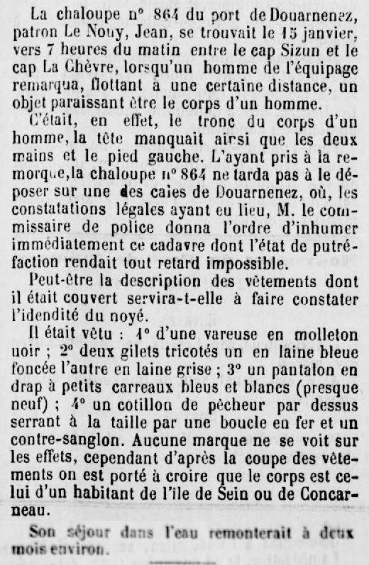 La chaloupe N° 864 du port de Douarnenez, patron Le Nouy, Jean, se trouvait le 15 janvier, vers 7 heures du matin...