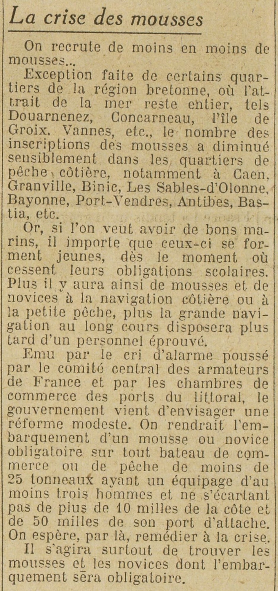 Crise, Recrutement, Mousses, Inscription, Diminution, Novices, Petite pêche, Pêche côtière, Personnel, Navigation au long cours, Comité central des armateurs, Signal d'alarme, Chambre de commerce, Gouvernement, Réforme, Remède