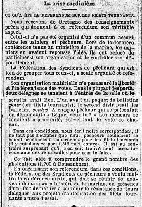 Journal Journal des débats Date 13 mars 1913 Mots-clés Crise sardinière, Filets tournants, Référendum, Renseignements, Fédération, Syndicat des pêcheurs, Organisation, Délégués, Liberté, Votes, Meneurs, Nombre, Abstentions Lieu(x) Douarnenez Contributeur(s) Jacques Join Image