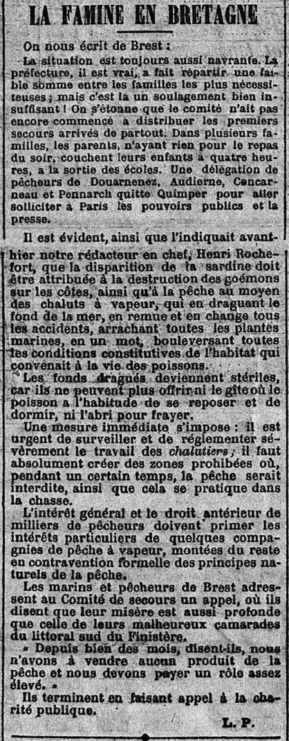 Famine, Préfecture, Répartition, Secours aux familles, Comité, Distribution, Délégation, Pêcheurs, Pouvoirs publics, Presse, Disparition, Sardine, Destruction, Goémon, Chalutier à vapeur, Dragage, Surveillance, Réglementation, Chalutiers, Zone prohibée, Interdiction pêche, Appel, Comité de secours, Misère, Charité