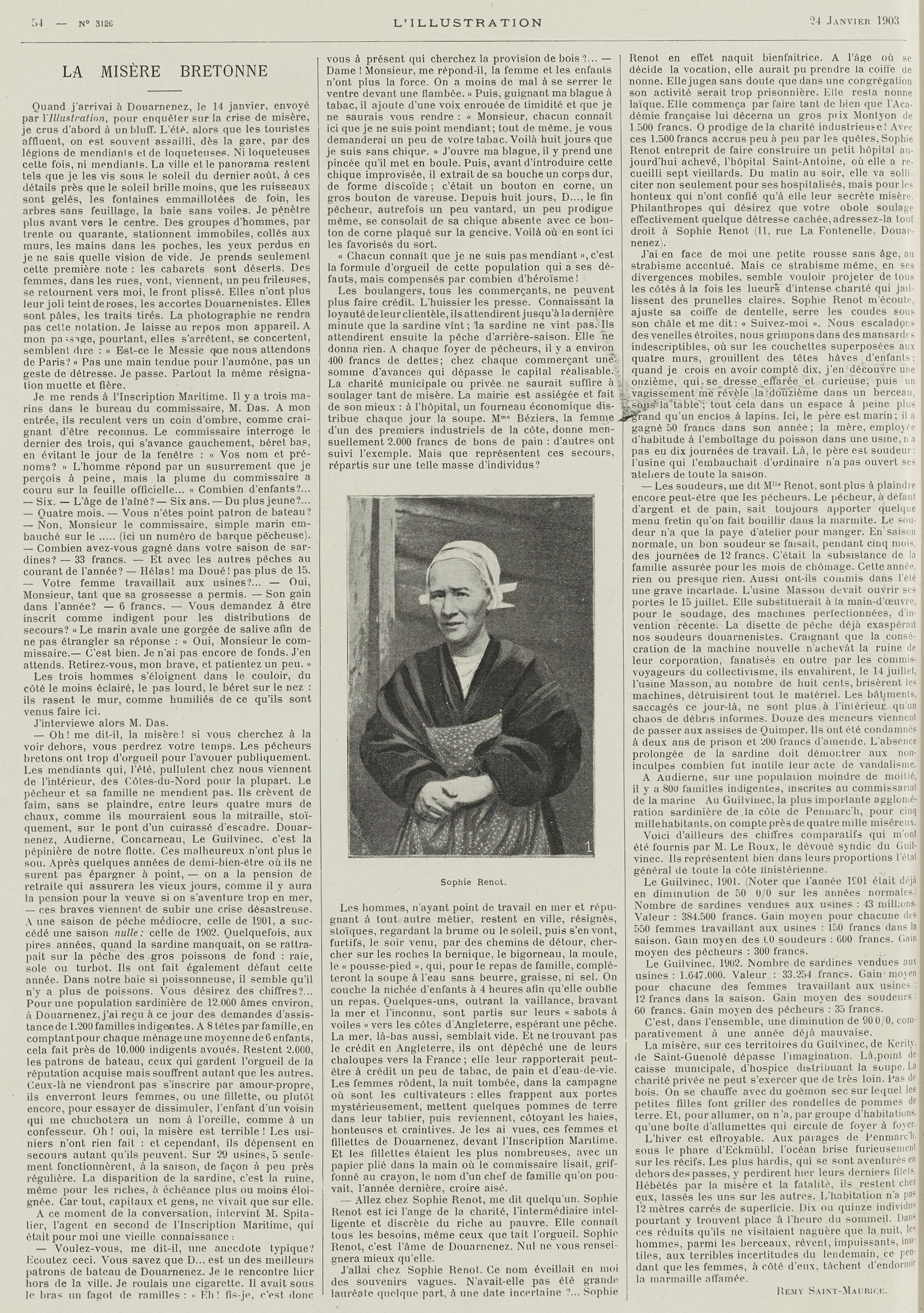 Crise sardinière, Misère, Touristes, Mendiants, Cabarets, Femmes, Résignation, Inscription maritime, Marins, Administrateur, Indigents, Distribution, Secours, Pêcheurs bretons, Pêche médiocre, Pêche nulle, Demande, Assistance, Familles, Usines fermées, Sardine, Disparition, Ruine, Orgueil, Population maritime, Héroîsme, Boulangers, Commerçants, Crédit, Dettes, Charité, Soulagement, Dons, Bons, Pain, Bienfaitrice, Prix, Académie française, Quête, Construction, Hôpital, Obole, Détresse, Soudeurs, Chômage, Saccage, Usine Masson, Invention, Machines à sertir, Meneurs, Cour d'assises, Condamnation, Prison, Amende, Vandalisme, Chiffres, Syndic, Soupe populaire, Faim, Famine