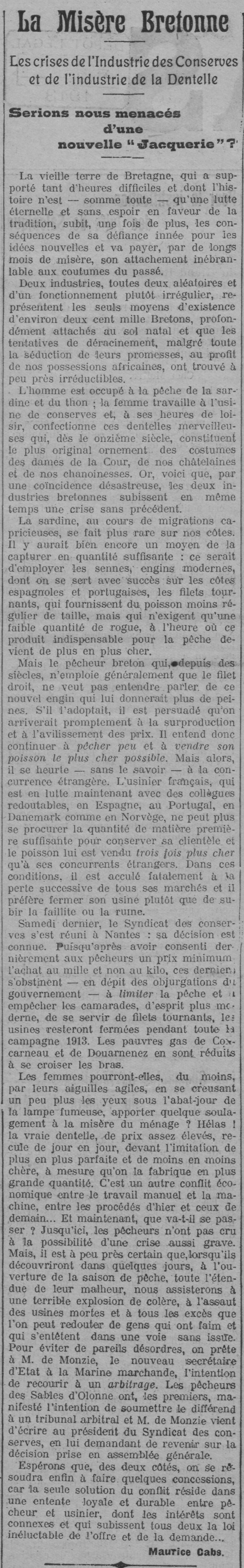 Crise sardinière, Industrie, Conserves, Dentelles, Menace, Jacquerie, Révolte, Tradition, Coutume, Pêche à la sardine, Pêche au thon, Femmes d'usine, Crise, Sennes, Filets tournants, Économie, Appât, Rogue, Pêcheurs bretons, Filets droits, Surproduction, Avilissement, Prix, Concurrence étrangère, Perte, Marché, Usines fermées, Faillite, Ruine, Réunion, Syndicat, Usiniers, Prix minimum, Limitation pêche, Chômage, Misère, Explosion, Colère, Faim, Abus, Désordre, Secrétaire d'Etat à la Marine, Appel, Arbitrage, Différend, Tribunal, Concessions, Solution, Conflit, Entente, Pêcheurs, Fabricants, Intérêts communs, Loi de l'offre et de la demande