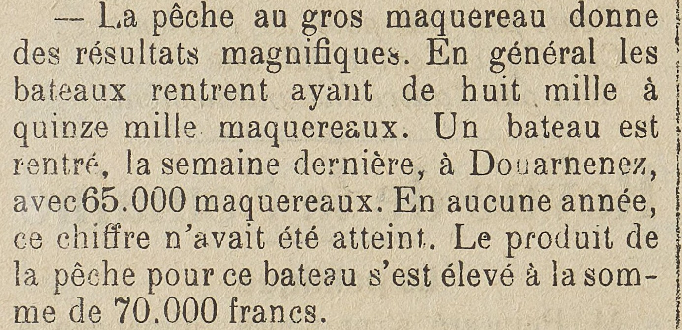 Journal Le Bas-Breton Date 07 avril 1928 Mots-clés Gros maquereau, Pêche magnifique, Résultats, Pêche record, Quantité, Prix Lieu(x) Douarnenez Contributeur(s) Jacques Join Image