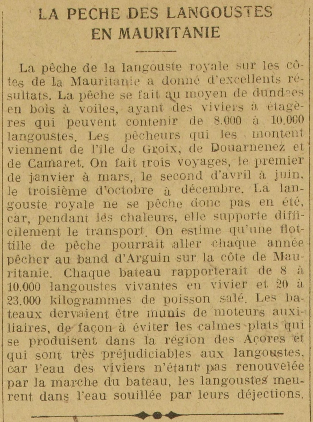 Journal La Liberté Date 21 septembre 1920 Mots-clés Pêche à la langouste, Langouste royale, Dundées, Viviers, Langouste vivante, Poisson salé, Moteur auxiliaire, Mortalité Lieu(x) Mauritanie, Groix, Douarnenez, Camaret, Banc d'Arguin, Açores Contributeur(s) Jacques Join Image