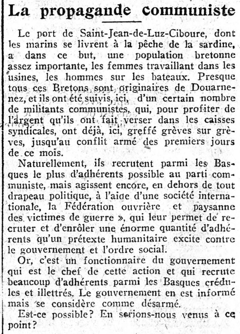 Journal Journal des débats Date 28 novembre 1926 Mots-clés Propagande, Pêche à la sardine, Population, Pêcheurs bretons, Militants, Communistes, Grèves, Conflit, Recrutement, Pêcheurs basques, Fonctionnaire, Gouvernement Lieu(x) Saint-Jean-de-Luz, Ciboure, Douarnenez Contributeur(s) Jacques Join Image