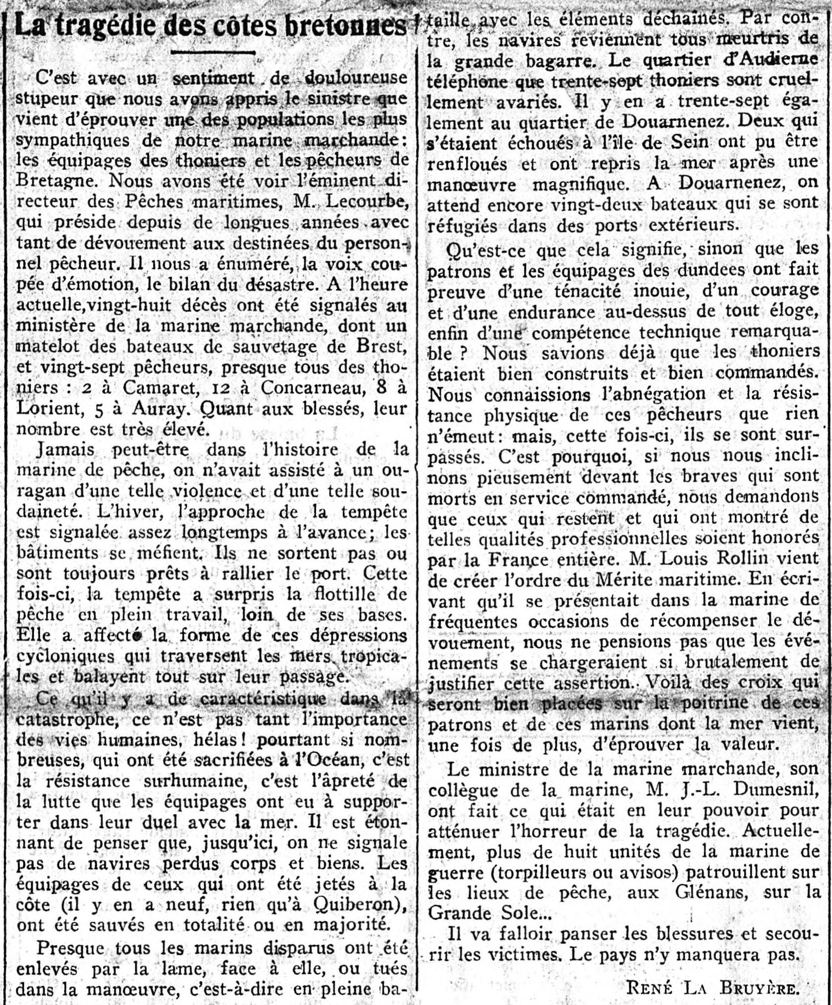 Tempête de 1930, Sinistre, Naufrage, Dundées, Thoniers, Bilan, Désastre, Décès, Blessés, Ouragan, Violence, Dépression, Catastrophe, Équipages, Lutte, Perdus corps et biens, Lame, Manoeuvre, Avaries, Courage, Endurance, Éloge, Abnégation, Résistance, Mérite maritime, Récompense, Dévouement, Croix, Ministre de la Marine marchande, Ministre de la Marine, Recherches, Marine de guerre, Lieux de pêche, Victimes, Secours