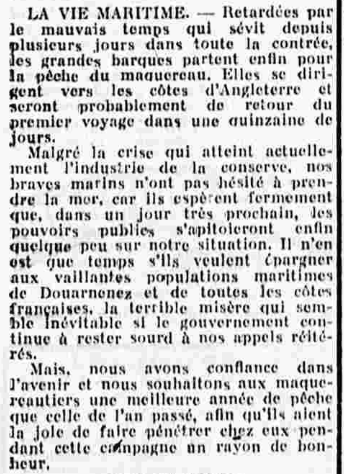 Journal Le Progrès du Finistère. Principal Date 02 mars 1935 Mots-clés Départ, Campagne de pêche, Maquereau de dérive, Appel, Gouvernement, Pouvoirs publics, Population maritime, Misère, Avenir Lieu(x) Douarnenez, Angleterre Contributeur(s) Jacques Join Image