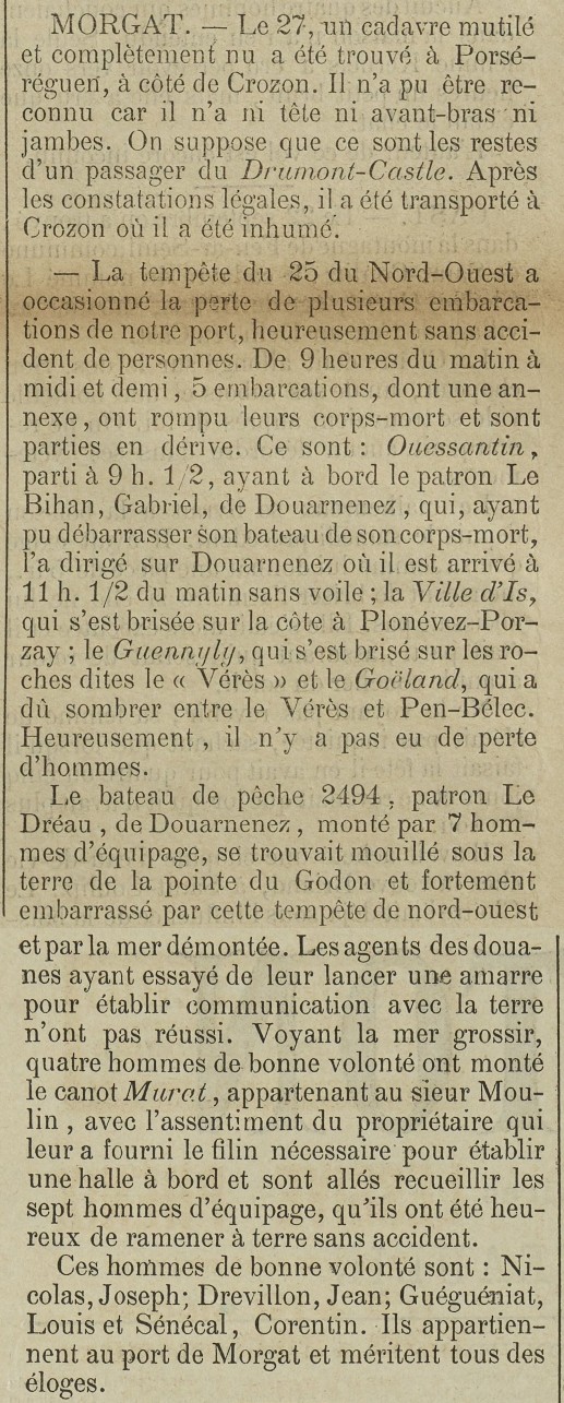 steamer anglais "Drummond Castle", "Ville d'Is", "Guennyly", "Goëland", canot "Murat"