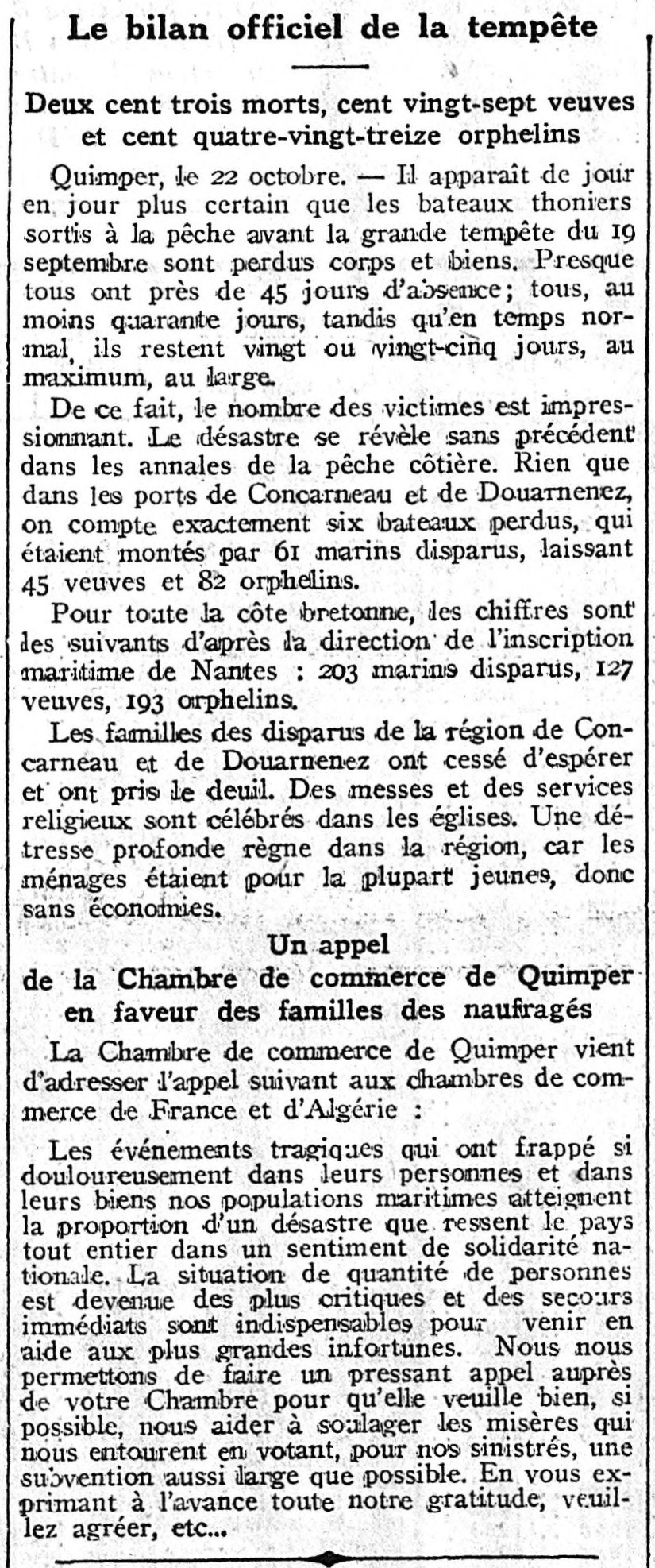 Le bilan officiel de la tempête - Deux cent trois morts, cent vingt-sept veuves et cent quatre-vingt-treize orphelins - Un appel de la Chambre de commerce de Quimper en faveur des familles des naufragés