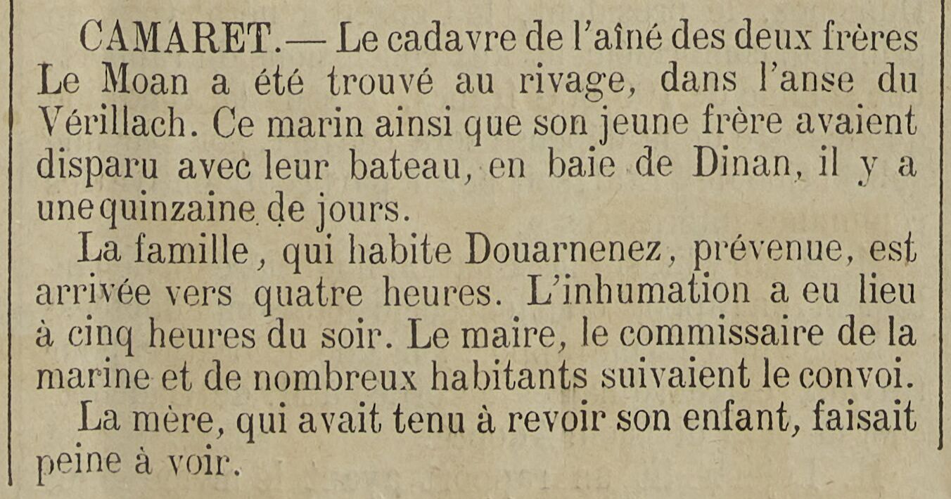 Journal Le Bas-Breton Date 07 septembre 1895 Bateau(x) DEUX SOEURS - ADZ2458 Chaloupe - 1894-1895 Mots-clés Découverte, Cadavre, Marin-pêcheur, Disparu en mer, Famille, Inhumation, Convoi, Maire, Commissaire de la marine, Habitants Lieu(x) Camaret, Vérillach, Baie de Dinan, Douarnenez Personnes frères Le Moan Contributeur(s) Jacques Join Image