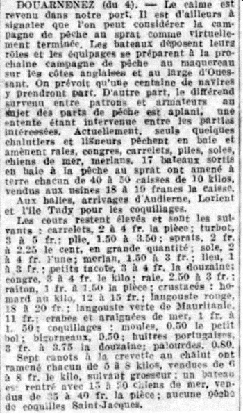 Journal La Dépêche du Finistère Date 05 février 1926 Mots-clés Sprat, Crise, Dépôt des rôles, Maquereau, Poisson, Prix, Quantité Lieu(x) Douarnenez Contributeur(s) Jacques Join Image