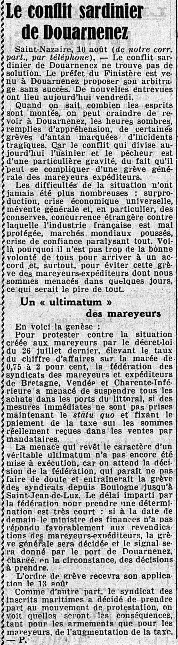 Conflit sardinier, Préfet, Proposition, Arbitrage, Échec, Entrevue, Grève générale, Mareyeur-expéditeur, Surproduction, Crise économique, Mévente, Conserves, Concurrence étrangère, Mareyeurs, Ultimatum, Protestation, Décret, Menace, Suspension, Achat de poisson, Littoral, Décision, Fédération, Syndicats, Revendications, Ministre des Finances
