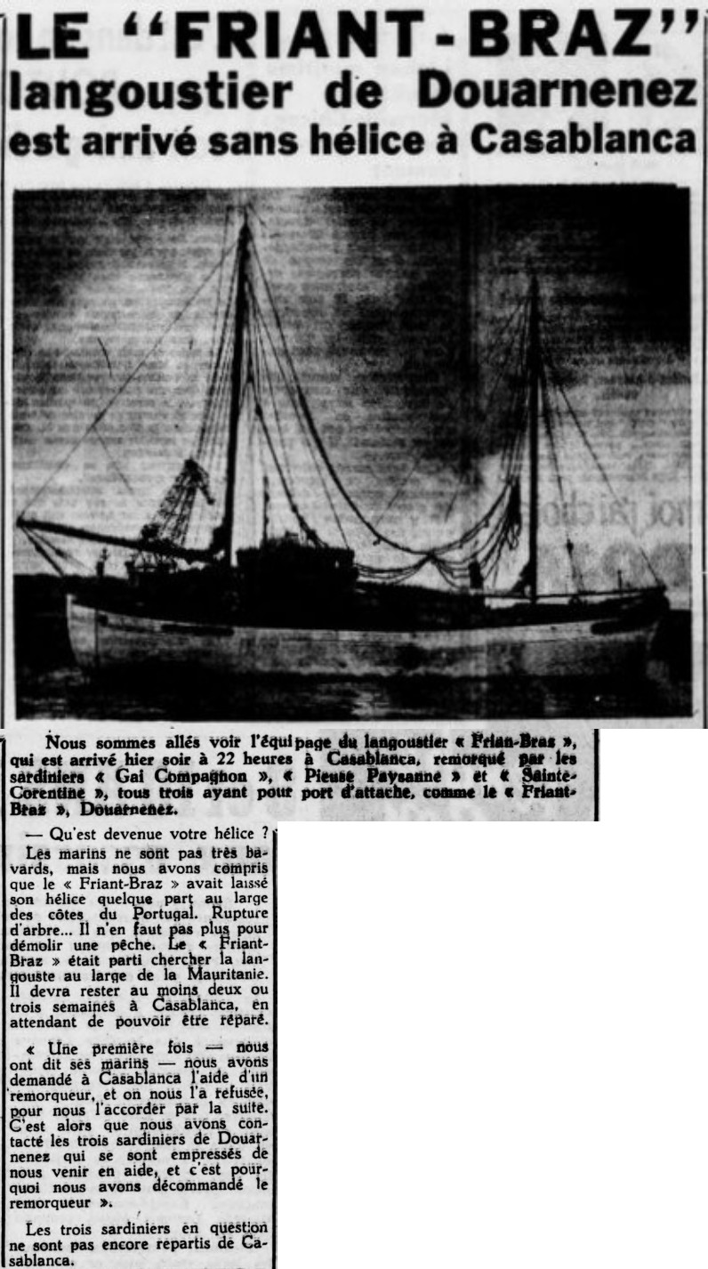 Journal Maroc-Presse Date 05 novembre 1952 Bateau(x) FRIANT BRAZ - RIGEL - DZ3795 Langoustier mauritanien - 1950-1969 AR CHEFF - GAI COMPAGNON - DZ3712 Malamok - 1946 PIEUSE PAYSANNE - DZ3407 Malamok - 1940-1961 SANT KAOURINTIN - DZ3674 Malamok - 1945-1966 Mots-clés Arrivée, Langoustier mauritanien, Remorquage, Malamock, Perte, Hélice, Réparation, Demande, Aide, Remorqueur Lieu(x) Douarnenez, Casablanca, Portugal, Mauritanie Contributeur(s) Jacques Join Image