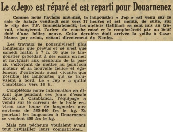 Journal Le Petit Marocain Date 20 août 1950 Bateau(x) JEP - DZ3765 Langoustier mauritanien - 1949-1969 Mots-clés Langoustier mauritanien, Cale, Slipway, Réparations, Arbre de couche, Hélice, Essais, Langouste vivante, Escale, Vente, Halle au poisson Lieu(x) Douarnenez, Casablanca, Maroc, Nantes Personnes ateliers Gallinari Contributeur(s) Jacques Join Image