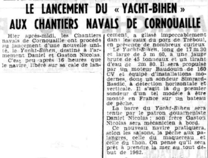 Journal Ouest-France Date 22 décembre 1961 Bateau(x) YACHT BIHEN - DZ4041 - DZ185125 Malamok - 1961 Mots-clés Lancement, Palangre, Maquereau, Thon Lieu(x) Chantier naval de Cornouaille,Tréboul Personnes Patron Daniel Nicolas, Mécanicien Gaston Nicolas, Contributeur(s) Audierne Bateaux Image
