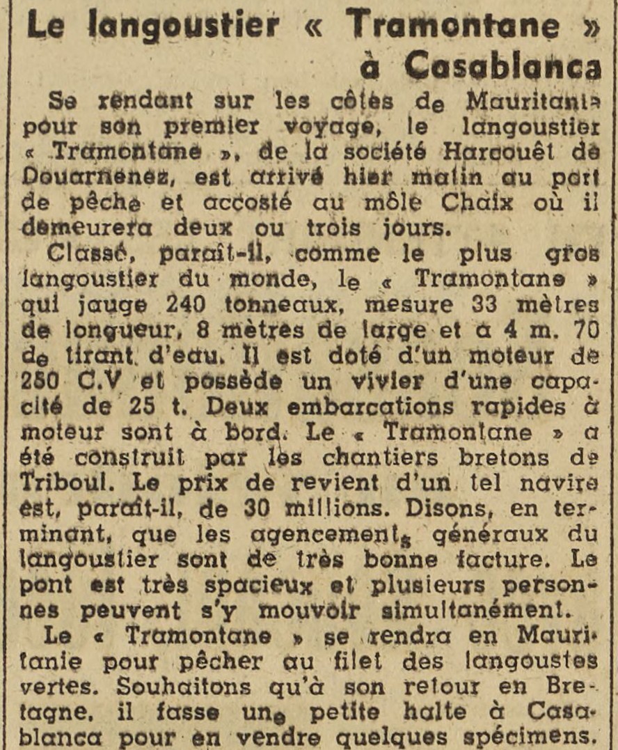 Journal Le Petit Marocain Date 14 février 1948 Bateau(x) TRAMONTANE - DZ3742 Langoustier mauritanien - 1948-1967 Mots-clés Escale, Langoustier mauritanien, Caractéristiques, Vivier, Annexes, Prix de revient, Installations, Langoustes vertes, Filets, Voeu Lieu(x) Casablanca, Douarnenez, Tréboul, Mauritanie, Bretagne Personnes patron Hascoët Contributeur(s) Jacques Join Image