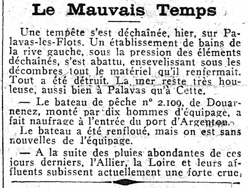 Mauvais temps, Tempête, Destruction, Établissement, Naufrage, Chaloupe, Renflouement, Équipage, Sans nouvelle, Pluie, Abondance, Crues
