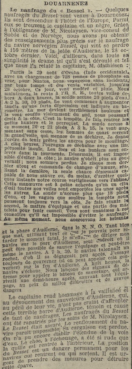 Naufrage, Bateau de commerce, Consul, Renseignements, Drame de mer, Tempête, Ouragan, Tourmente, Talonnage, Échouement, Signaux de détresse, Canot de sauvetage, Équipage sauvé, Hommage, Dévouement, Sauveteurs, Rapatriement, Renflouement, Cargaison, Danger, Navigation, Urgence, Mesures, Destruction, Épave