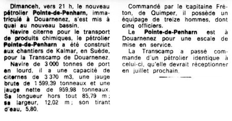Journal Ouest-France Date 24 décembre 1974 Bateau(x) POINTE DE PENHARN - POINTE DU VAN Petrolier, Divers - 1974-2000 Mots-clés Transcamp Douarnenez Lieu(x) Douarnenez, Suède Personnes Capitaine Freton Contributeur(s) Audierne Bateaux Image