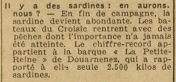 Journal Le Franc-tireur Date 10 septembre 1946 Bateau(x) PETITE REINE - DZ3165 Pinasse - 1934-1950 Mots-clés Ravitaillement, Sardine, Fin de campagne, Abondance, Quantité, Record Lieu(x) Le Croisic, Douarnenez Contributeur(s) Jacques Join Image