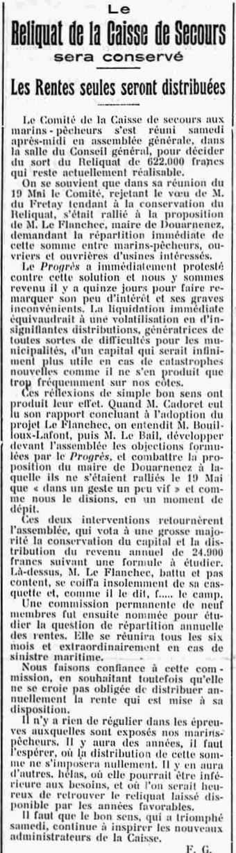 Journal Le Progrès du Finistère. Principal Date 07 juillet 1928 Mots-clés Assemblée générale, Comité de secours, Marins-pêcheurs, Préfecture, Conservation, Capital, Distribution, Répartition, Rentes, Proposition, Protestation, Commission, Examen, Catastrophe, Sinistre Personnes MM. du Fretay, Le Flanchec, Cadoret, Bouilloux-Lafont, Le Bail Contributeur(s) Jacques Join Image