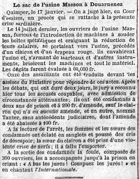Journal Journal des débats Date 18 janvier 1903 Mots-clés Tribunal, Cour d'assises, Jugement, Procès, Crise sardinière, Manifestation, Soudeurs, Drapeau rouge, Saccage, Usine, Dégâts, Comparution, Débats, Jury, Circonstances atténuantes, Condamnation, Prison, Amende, Foule, Chant, L'Internationale Lieu(x) Douarnenez, Quimper, Finistère Personnes usine Masson, Tanter Contributeur(s) Jacques Join Image