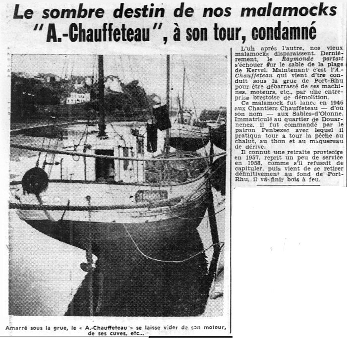 Journal Ouest-France Date 02 février 1961 Bateau(x) AIMÉ CHAUFFETEAU - DZ3694 Malamok - 1946 RAYMONDE - DZ3440 Dundee - 1940 Mots-clés Grue, Moteur, Cuves, Malamock, Chalut, Thon, Maquereau de dérive, Bois de feu Lieu(x) Kervel, Port-Rhu, Chantier Chauffeteau, Les Sables d'Olonne, Douarnenez Personnes Patron Pendézec, Contributeur(s) Audierne Bateaux Image