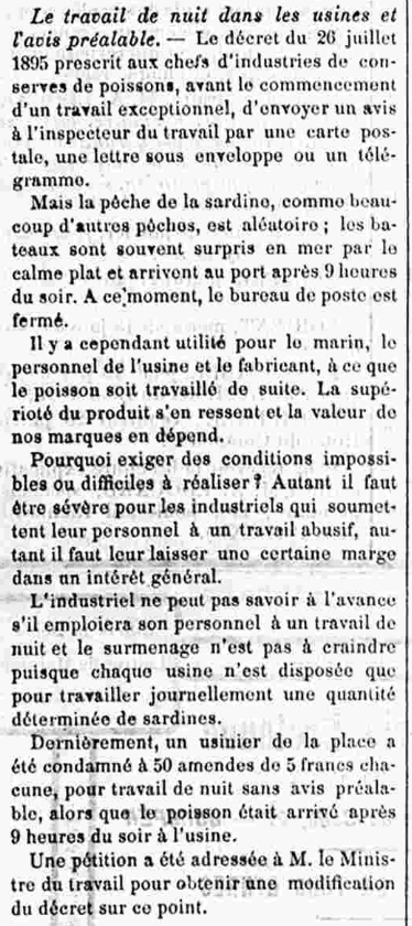 Journal Le Citoyen Date 14 janvier 1911 Mots-clés Décret, Industriel conserve, Travail de nuit, Avis préalable, Inspecteur du travail, Pêche à la sardine, Usinier, Condamnation, Amendes, Pétition, Ministre du Travail, Modification, Réglementation Lieu(x) Douarnenez Contributeur(s) Jacques Join Image