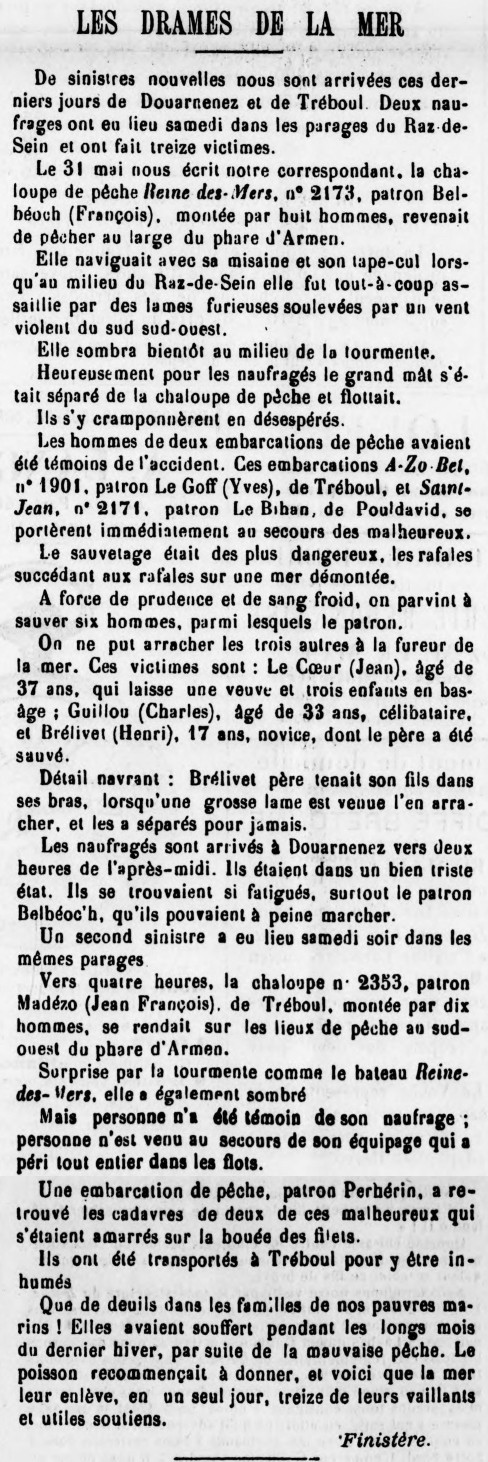 patrons François Belbéoch, Yves Le Goff et Le Bihan, matelots Jean Le Cœur et Charles Guillou, novice Henri Brélivet, Brélivet père, patrons Jean-François Madézo et Perhérin