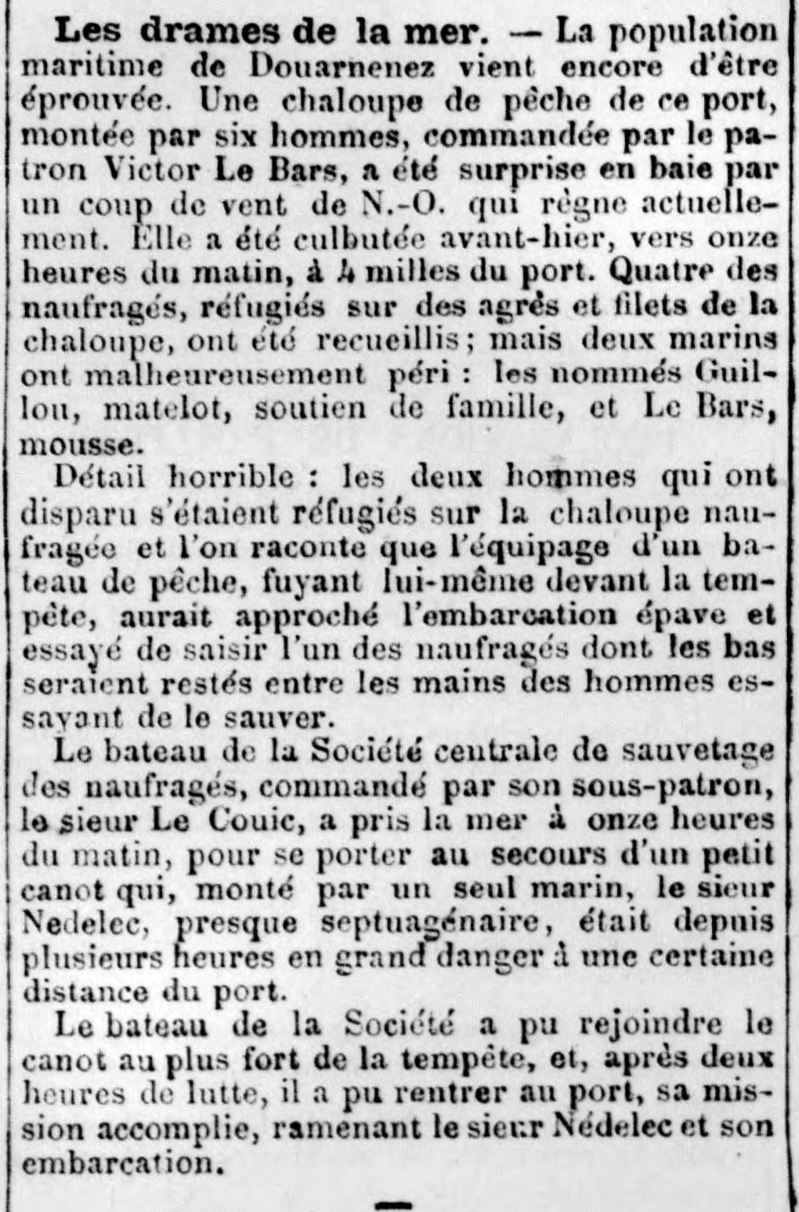 patron Victor Le Bars, matelot Guillou, mousse Le Bars, sous-patron Le Couic, marin Nédélec