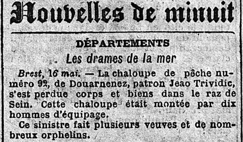 Journal L'Intransigeant Date 18 mai 1898 Bateau(x) AMI DE LA FRANCE - DZ92 Chaloupe - 1896-1898 Mots-clés Drame de mer, Naufrage, Chaloupe, Perdu corps et biens, Sinistre, Veuves, Orphelins Lieu(x) Brest, Douarnenez, Raz de Sein Personnes patron Jean Trévidic Contributeur(s) Jacques Join Image