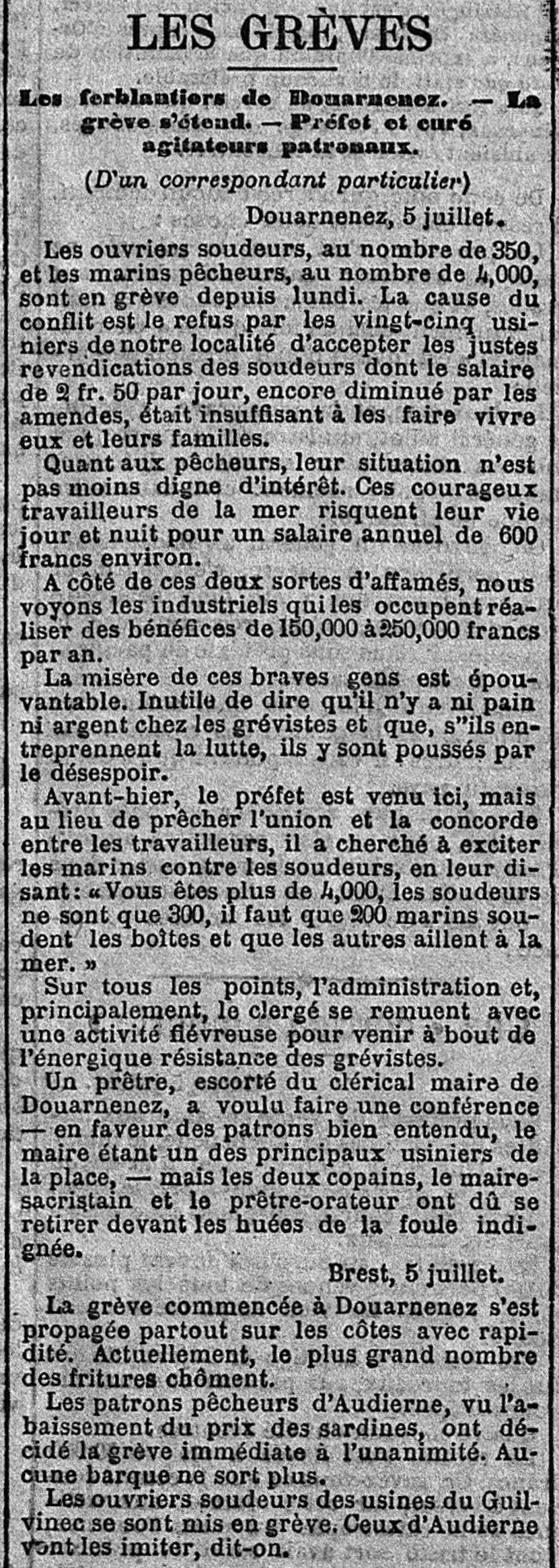 Grève, Ferblantiers, Soudeurs, Pêcheurs, Conflit, Revendications, Salaire, Amendes, Industriels, Bénéfices, Misère, Pain, Préfet, Administration, Clergé, Prêtre, Maire, Conférence, Huées, Foule, Chômage, Fritures, Sardines, Prix, Baisse