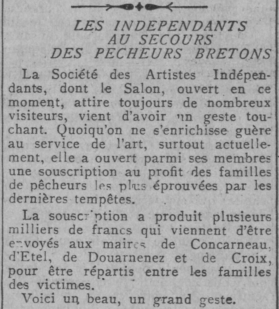 Journal Comœdia Date 11 février 1931 Bateau(x) GLAZ BIHEN - DZ2579 Dundee - 1924-1930 STEREDEN AR MINTIN - DZ2586 Dundee à moteur - 1924-1930 Mots-clés Artistes, Membres, Souscription, Familles, Pêcheurs bretons, Péris en mer, Tempête de 1930, Maire, Répartition, Secours Lieu(x) Concarneau, Étel, Douarnenez, Groix Contributeur(s) Jacques Join Image