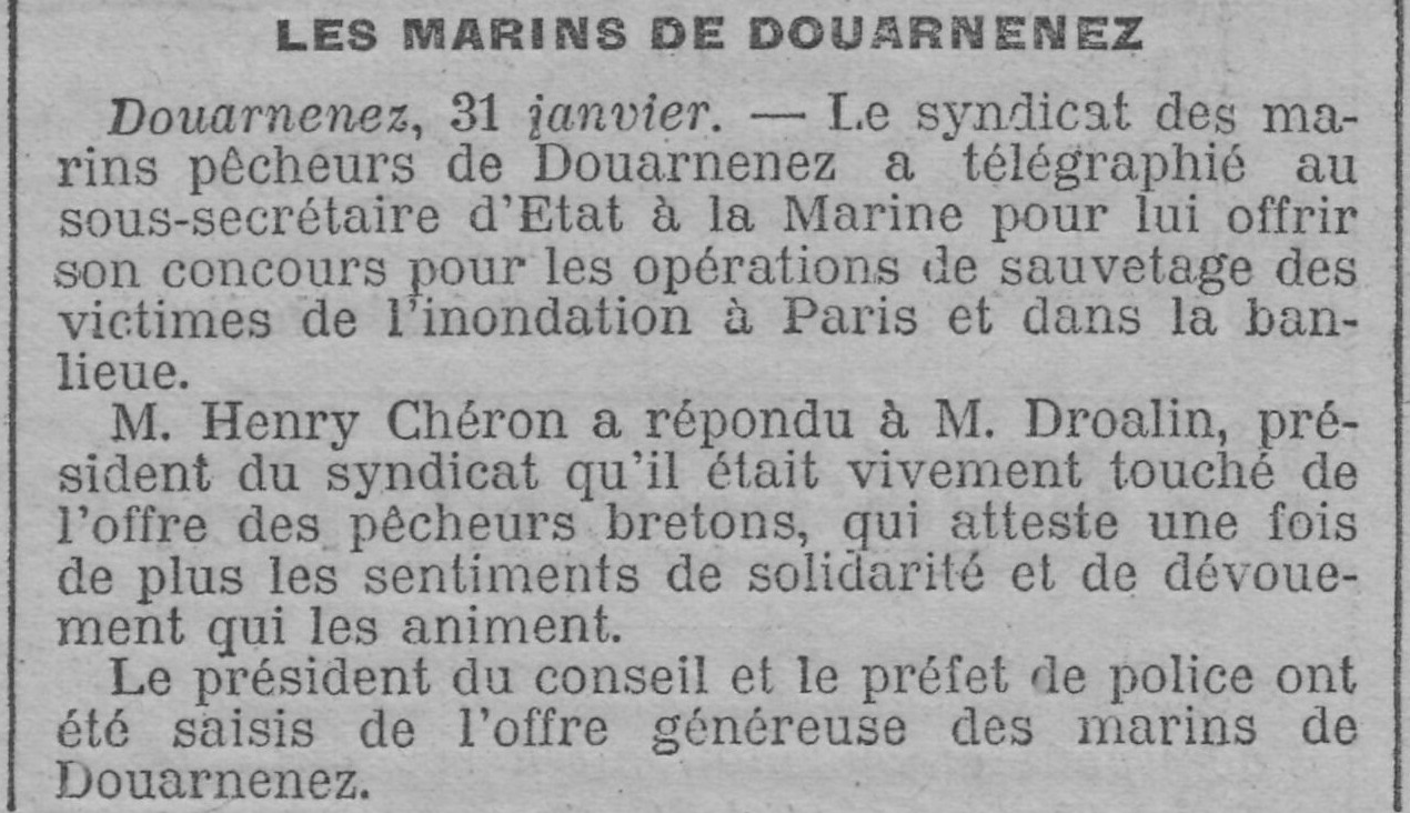 Journal Gil Blas Date 01 février 1910 Mots-clés Syndicat, Marins-pêcheurs, Télégraphe, Offre, Concours, Sauvetage, Victimes, Inondation, Solidarité, Dévouement, Président du Conseil, Préfet de police, Générosité Lieu(x) Douarnenez, Paris Personnes MM. Henry Chéron, Droalin Contributeur(s) Jacques Join Image
