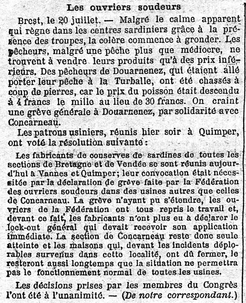 Journal Journal des débats Date 21 juillet 1909 Mots-clés Crise sardinière, Troupes, Colère, Prix du poisson, Baisse, Crainte, Grève générale, Solidarité, Réunion, Fabricants, Conserves, Sardines, Ouvriers, Soudeurs, Reprise, Travail, Déclaration, Lock-out, Incidents, Usines fermées, Décision, Membres, Congrès Lieu(x) Brest, Douarnenez, La Turballe, Concarneau, Quimper, Bretagne, Vendée, Vannes Contributeur(s) Jacques Join Image