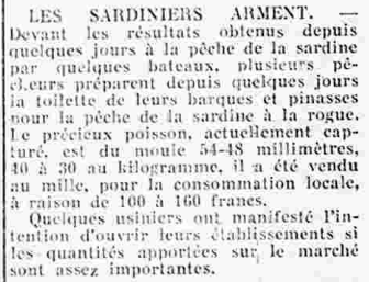 Journal Le Progrès du Finistère. Principal Date 27 mai 1933 Mots-clés Sardine de rogue, Pinasses, Armement, Moule, Vente au mille, Prix, Usines, Ouverture, Apports Lieu(x) Douarnenez Contributeur(s) Jacques Join Image