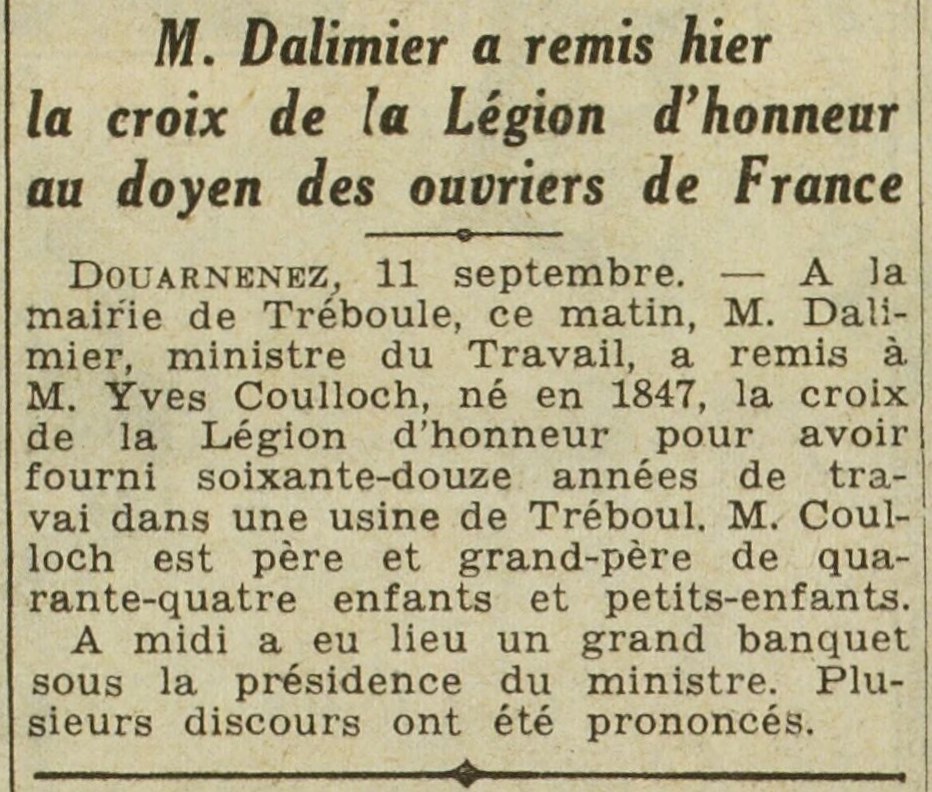 Journal Excelsior Date 12 septembre 1932 Mots-clés Ministre du Travail, Remise de décoration, Croix, Légion d'honneur, Doyen, Contremaître, Usine de conserves, Banquet, Discours Lieu(x) France, Tréboul Personnes M. Dalimier, Yves Coulloc'h, usine Lemarchand Contributeur(s) Jacques Join Image