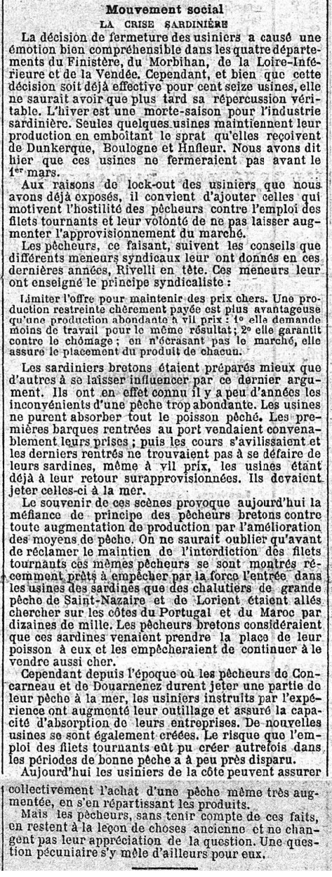 Crise sardinière, Conflit social, Usiniers, Décision, Fermeture, Usines, Lock-out, Pêcheurs, Hostilité, Filets tournants, Meneurs, Syndicats, Limitation pêche, Maintien, Prix, Pêche abondante, Avilissement, Concurrence étrangère