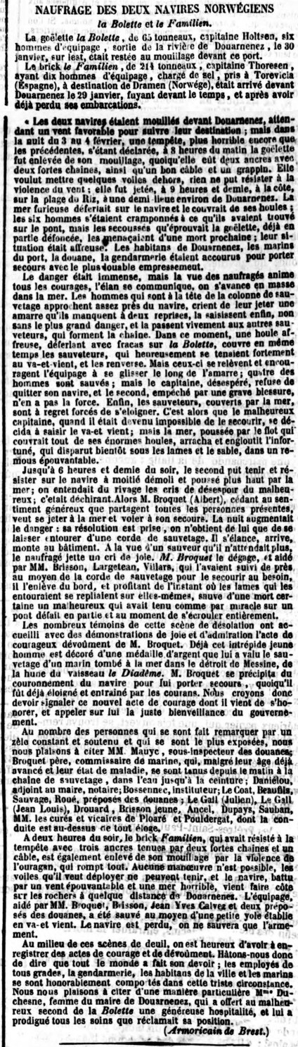 goëlette norvégienne la "Bolette", brick norvégien le "Familien", vaisseau le "Diadème"