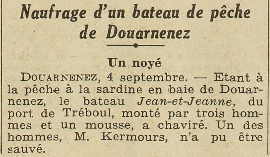 Journal Excelsior Date 05 septembre 1934 Bateau(x) JEAN JEANNE - DZ3150 Pinasse - 1933-1950 Mots-clés Pinasse, Canots, Annexes, Pêche à la sardine, Chavirage, Noyé Lieu(x) Douarnenez, Baie de Douarnenez Personnes Édouard Kernours Contributeur(s) Jacques Join Image
