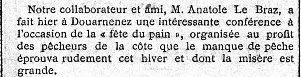 Journal Journal des débats Date 03 mars 1908 Mots-clés Écrivain, Poète, Historien, Conférence, Fête du pain, Profit, Pêcheurs, Pénurie, Disette, Misère, Famine Lieu(x) Douarnenez Personnes Anatole Le Braz Contributeur(s) Jacques Join Image